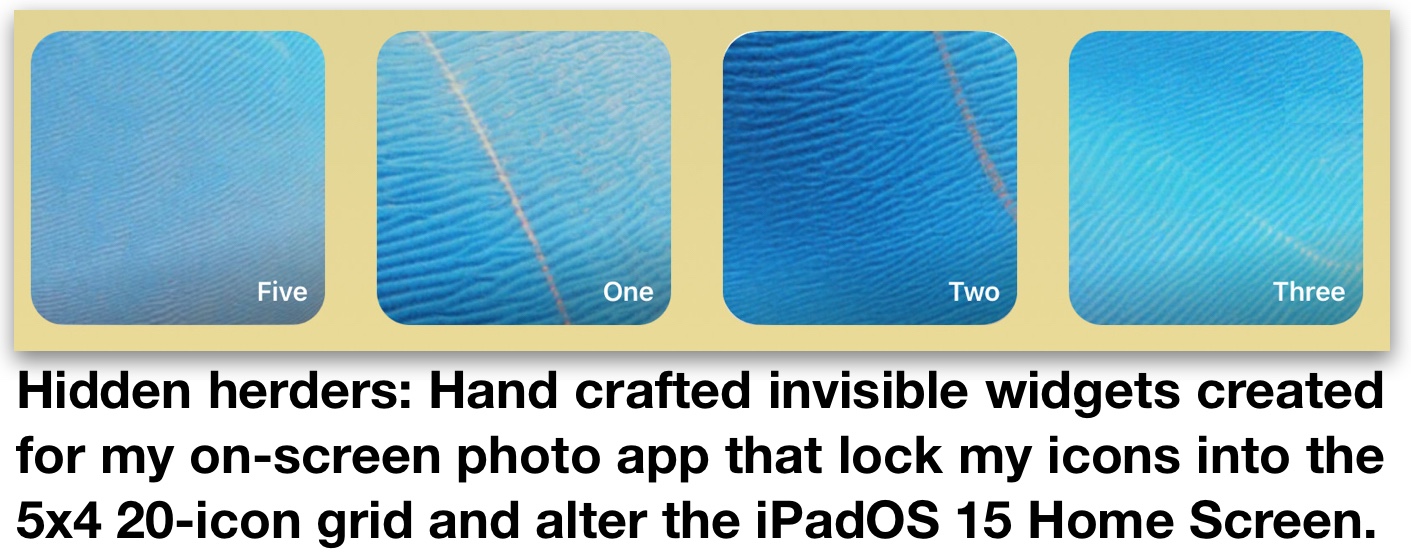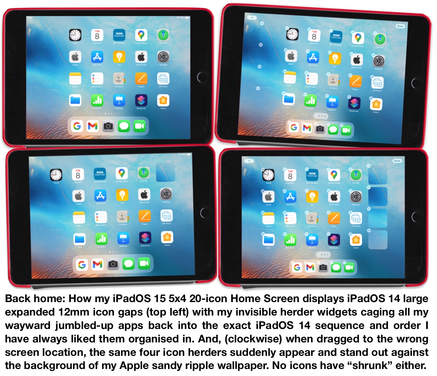 At present I have been using an on-screen widget photo app as an icon herder to re-inflate the gaps between icons in iPadOS15 back up to their former 12mm spacing and to round-up and lock my wayward icons back into the exact order I had them in under the old iPadOS 14 5x4 20-icon grid pattern regime. The screenshots below depict the transformation that can be achieved.