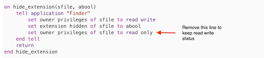 I download a lot of PDF's and rename them with pertinent details about the file. Most will automatically remove the file extension when I rename them, but some do not and I usually remove it manually so that the exceptions are less distracting in column view. I searched and found a great automator quick action by VikingOSX that will do the hiding of the file extensions, however what I'm finding is that ones which need this done on also need to have their permissions changed from 'read only' to 'read and write' before the quick action will work. Is there a way to add the required permission change to this workflow so that it can be a one step operation to accomplish the desired action?