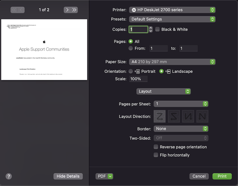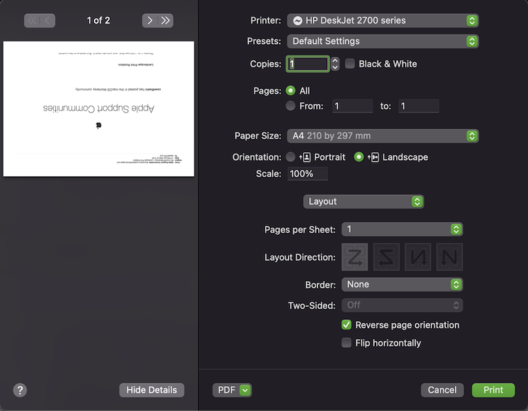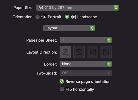 I would like landscape documents to rotate to the left (counterclockwise) on my printer rather than to the right (clockwise). The Print dialog doesn't seem to have an option to change that, nor do I see anything in my preferences. Is there a way to accomplish this with settings/preferences?