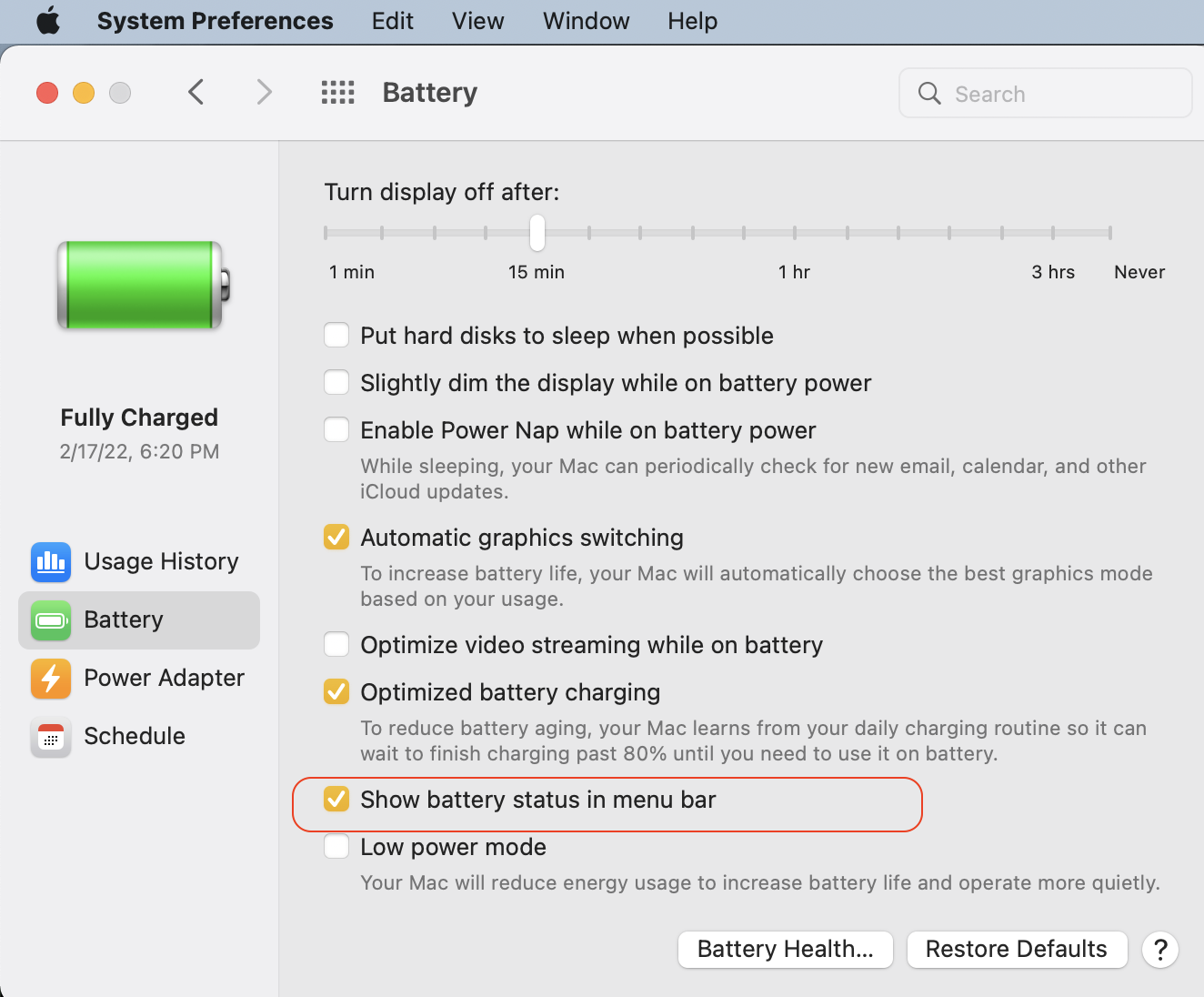Check out this link to learn more information about your MacBook battery: Get help with your Mac notebook battery. Also, try to uncheck "Show battery status in menu bar" then restart your Mac. Once that has been restarted, go back into the Battery settings and re-check "Show battery status in menu bar." Does that help to correct the issue?