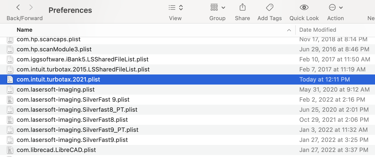 3) Screen Shot 3 shows the Preferences after Scrolling Down to find file names like “com.intuit.turbotax.2021.plist”. This screen shot shows only one, 2021, but there may be more similar for earlier years. Select all of the “…Intuit.turbotax…”, “xxxx.plist” files and Delete them to Trash.