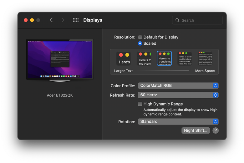 I just got a new Mac Mini for my birthday. Yey me! I have an ACER ET322QK screen and I gotta say the screen looks like ***. The brightness is so high that any and all blacks looks bad. Things that look great on my laptop look super red and washed out on the screen now. I used to connect the screen to a laptop and use a duel setup. The screen looked fine with this as the laptop has control for the laptop screen and the big monitor.