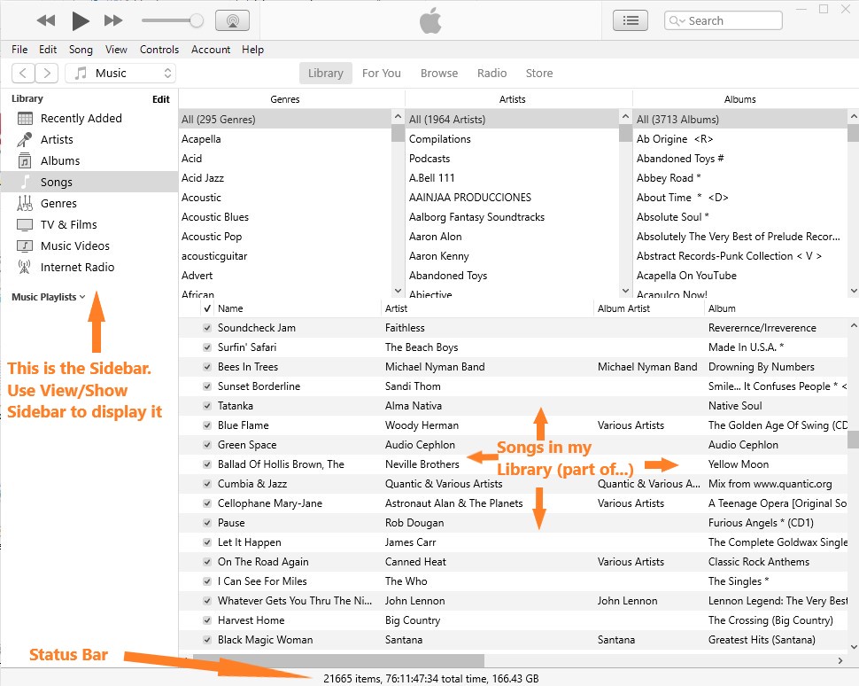 - files added to your library (as above) will be displayed in the Library section. There are several different views: Albums, Artists, Songs, Genres and Composers. You can make use of any or none of them, as you choose. If you have a look around your Library, you can decide which view or views you like and change between them easily
