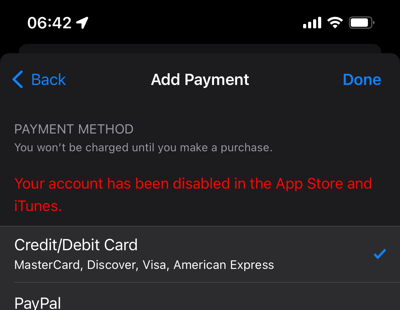 When I try to make a purchase it says that my account has been disabled in iTunes and App Store