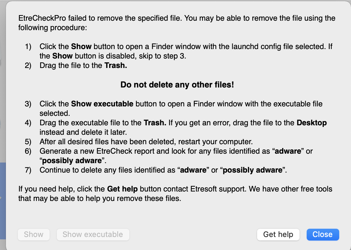 The only way to remove these files is with official uninstallers or uninstallation instructions provided directly by the developer. Never use an “app zapper” or “clean up” tool to uninstall software. Never try to manually delete files in these hidden directories by hand. Do not use EtreCheck’s “Remove” buttons either. Those are only designed for adware and malware.