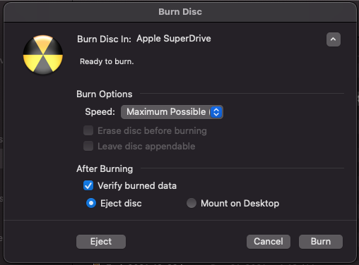 I have a data CD (imaging files) that I want to duplicate so that I can give a copy to another person. I have a MacBook Pro (Retina, 13-inch, Mid 2014), running Big Sur 11.6.4. I have an Apple USB SuperDrive.
