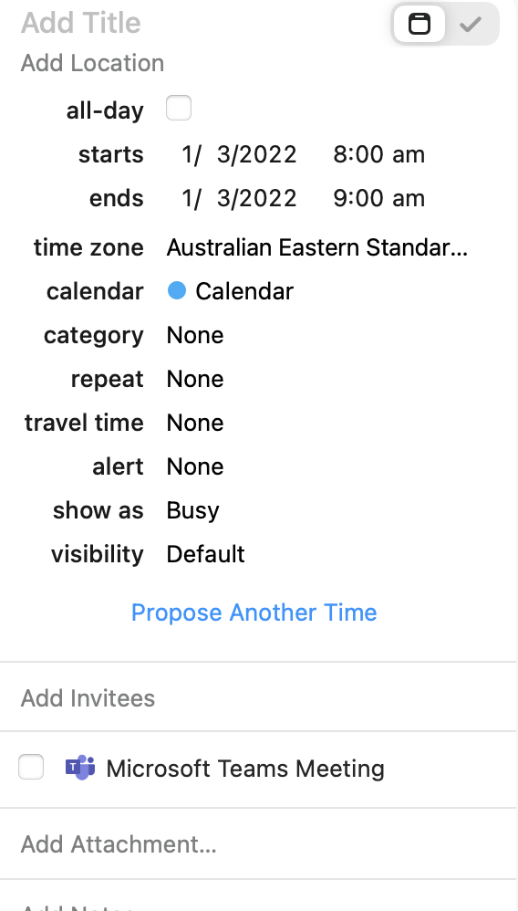 Does anyone know if there is any way to add MS Teams meeting to Apple Calendar? I've included a screenshot of how Fantastical2 does it...There's a tick box to include MS Teams link to an invite.