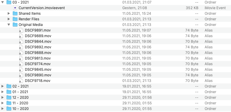 I have used the iMovie library as the storage folder for my original media files (all .mov files between 2020-2021 were imported into iMovie and saved in the library folder structure, approx. 100 GB, stored on an external LaCie hard drive). When I open iMovie, all files show as "missing" (it happened after I renamed some folders in iMovie itself). When I open the iMovie library folder, all the original media files still show in the sub-folders (i.e. iMovie library / 2020 / 03 / Original Media / DSCF5405.mov). However, the file size of original media (all .mov files were in range between 500MB to 2GB, 325 files in total) is reduced to 70 bites. The .mov-files cannot be opened. Unfortunately, the Time Machine Backup is not helping as it did not include the external LaCie harddrive. The external hard drive is two years old and several disk scans show no sign of corruption or damage.