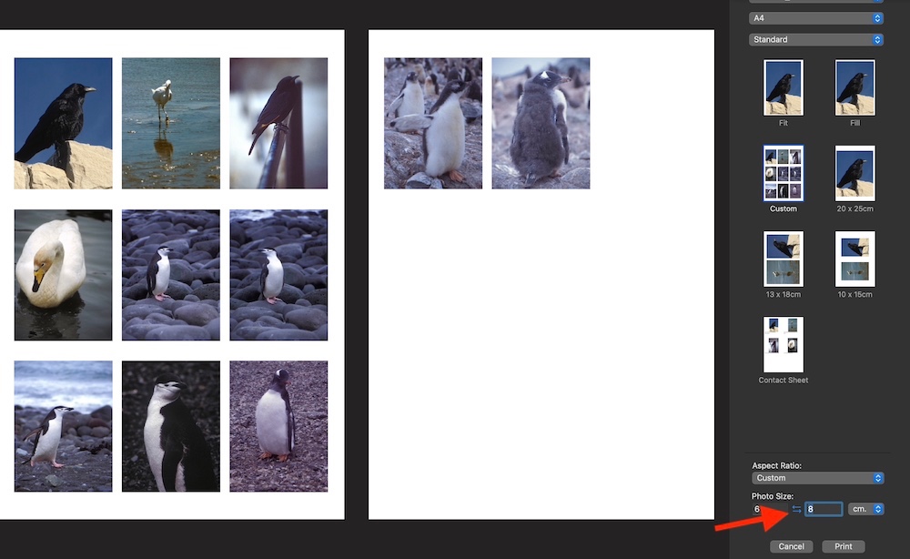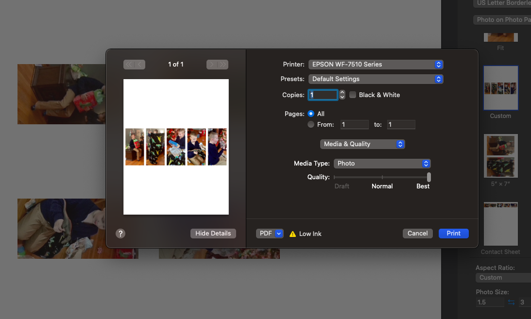 When previewing my pictures before printing, they will be set up one way (example: 5 pics side by side from top to bottom of the paper), but when I go to print them, it shows up as 2 rows of 2 pics and 1 row of 1 pic. Why does it get rearranged from the preview to the print page? Is there a way to change that? What am I missing?