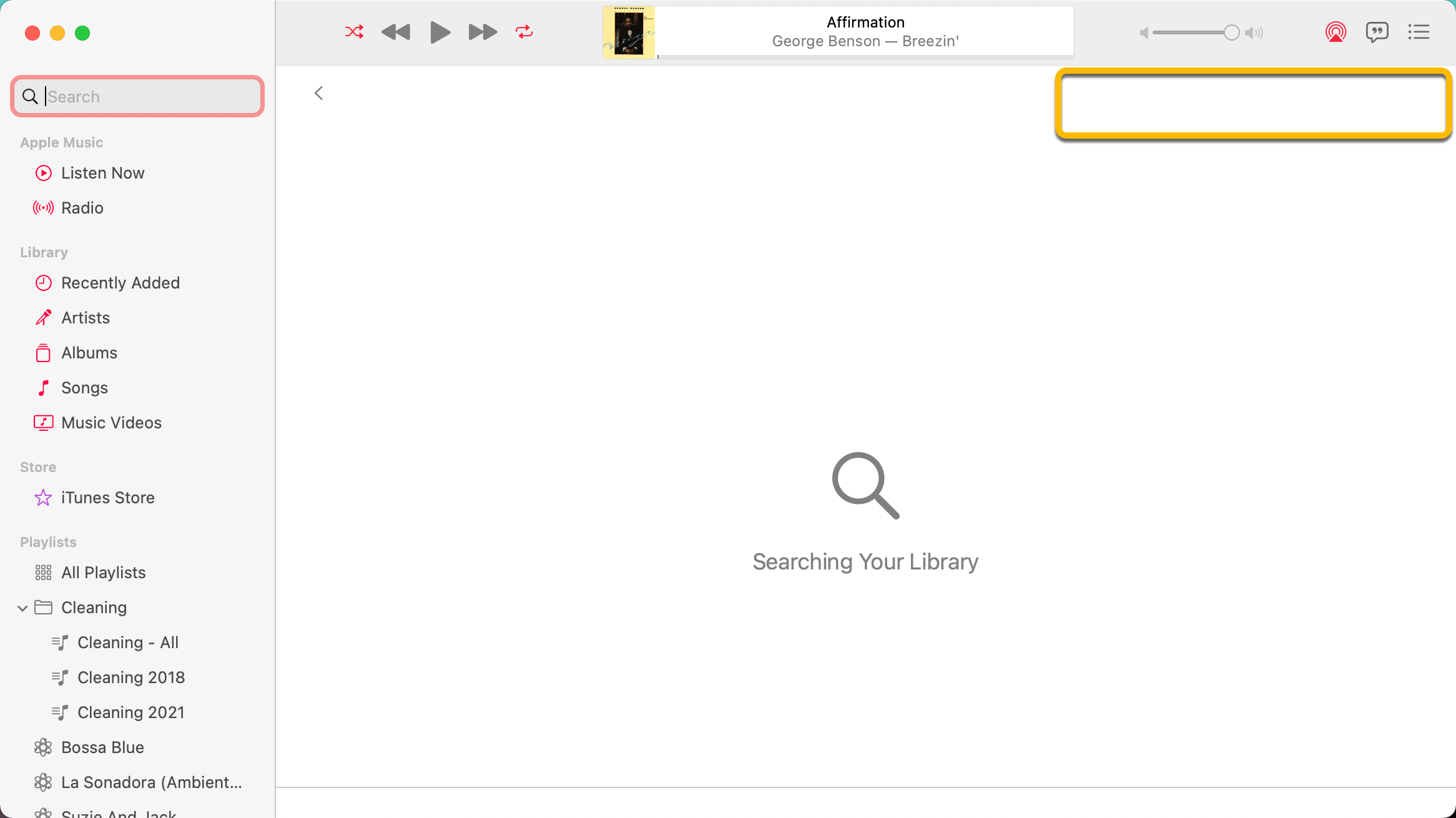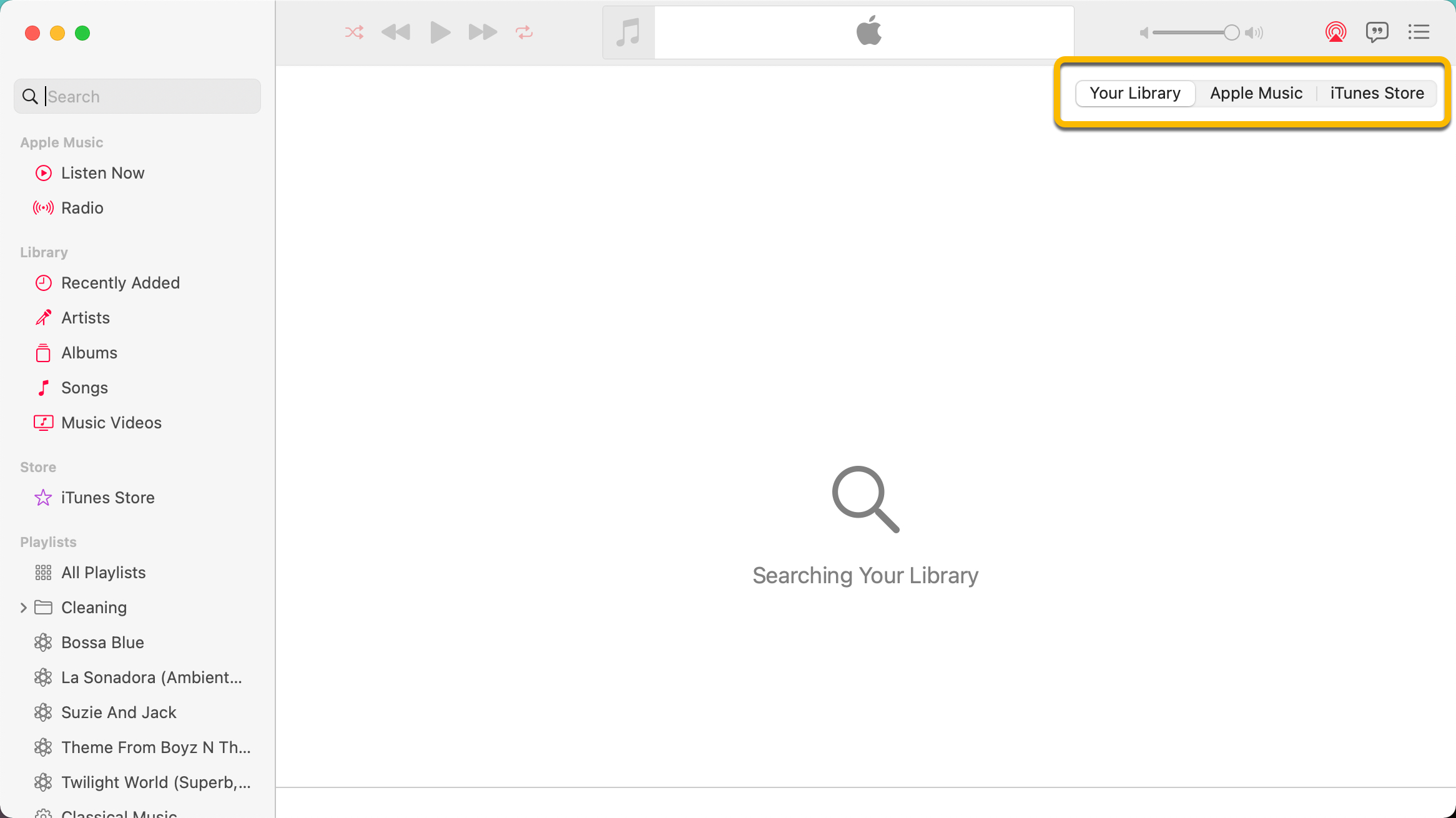 I'm using Music version 1.2.2.40 on my Mac running OS Monterey 12.2.1. After I conduct a search, the search domains in the upper right (Your Library, Apple Music, iTunes Store) disappear from the UI. This happens after I search my library and also after I search the iTunes store. I'm unable to switch the search back to a different domain. The options are gone.