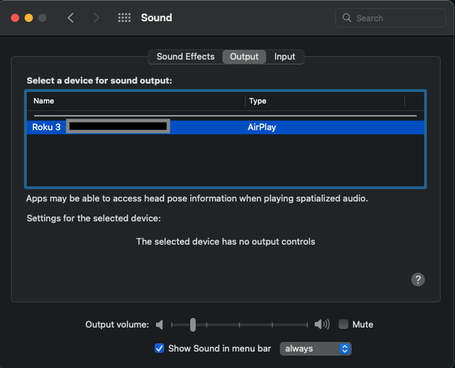 My audio Settings have changed to Roku Stick and the Mute button is dimmed. I cannot use the sound on my Macbook