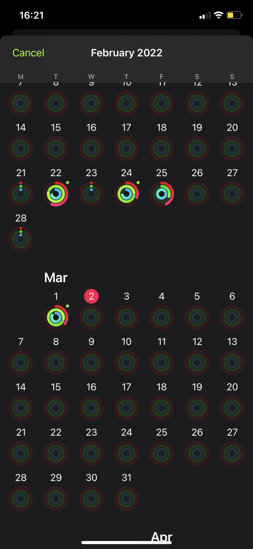 I’m a new user, and I have a question. As in the picture, why are the circles on the 21st, 23rd and 28th of the month highlighted, and not on the 26th and 27th? I must mention that I had my watch turned off ALL these days. So why are some days highlighted and some not? Does it have something to do with the weekend?