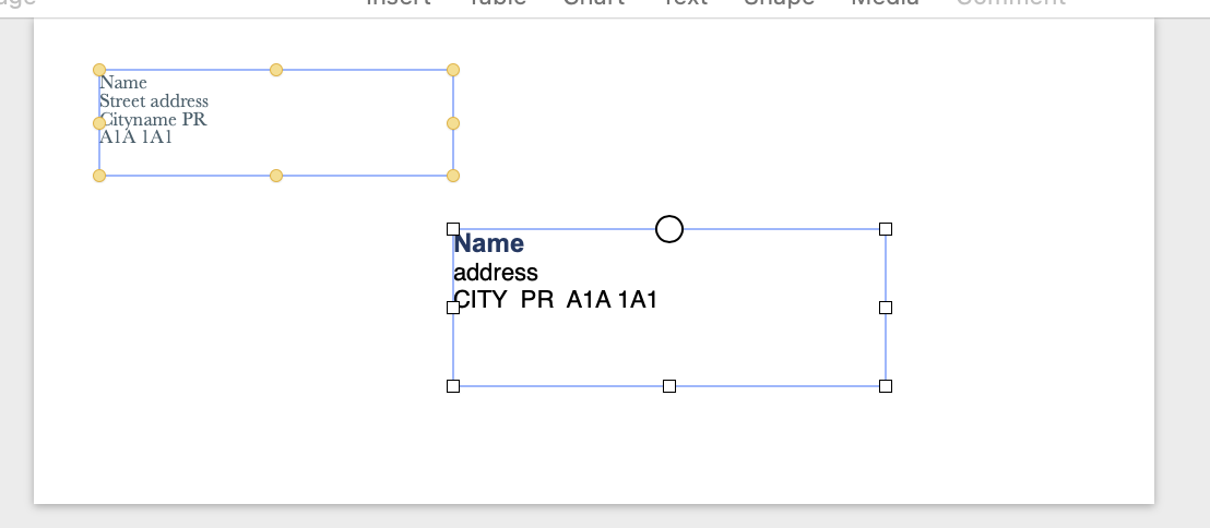 Placing the return address and the destination address in separate text boxes makes it easy to quickly place these two addresses independently.