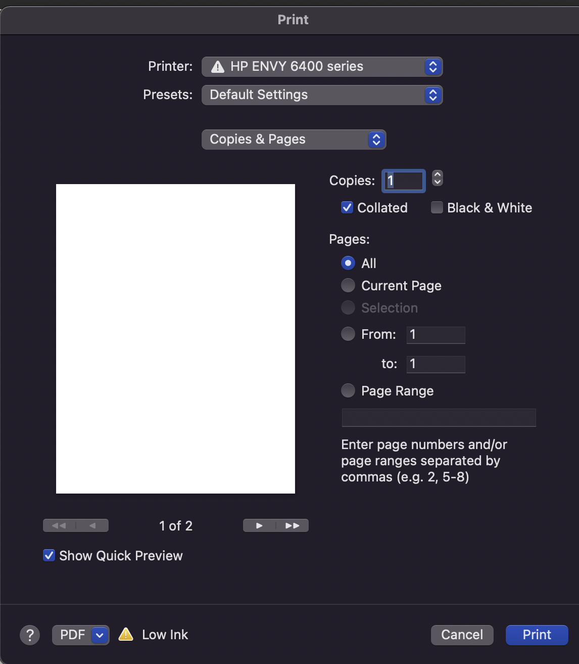 I am attempting to print a document in Word and I cannot change from two-sided to one-sided but there is no option to do so. There is nothing that says "show details". There are only default settings and they cannot be altered.
