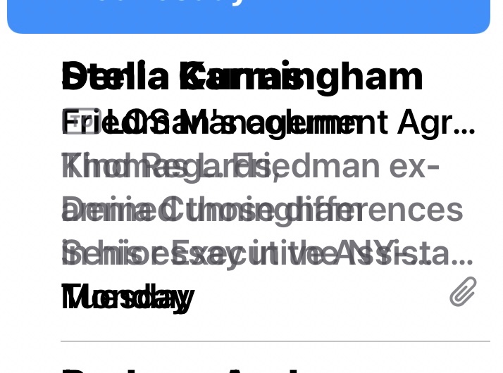 My wife's iPad Pro produces garbled text in the left column of Mail for one of the several emails in that column. As soon as I click on that garbled text, it clears and the garbled text section moves up or down to another email in the same column. I did a screen shot of just the garbled text to avoid displaying personal emails. This garbling does not occur on her iPhone 6S. Just on her iPad Pro purchased a year