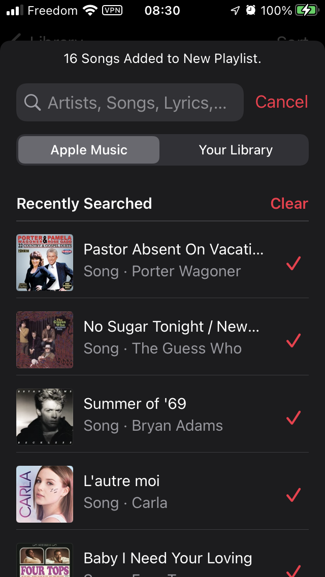 I pressed the “add songs to playlist” and this is where it brought me. I picked out songs and pressed the plus button to add to playlist but as you can see there’s no option to confirm the choices. Only cancel. I need access to the done button (which is hidden). It seems to be the window overlapping the done button is too large or something strange. I see no other way where I can add songs to my new playlist.