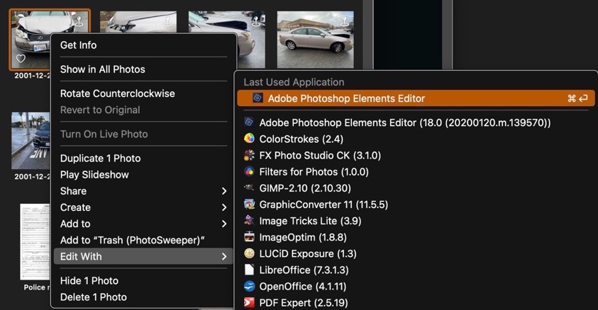 How are you accessing the editing by Photoshop Elements? Are you selecting a photo in your library and using one of these menus to open PSE and edit the photo: