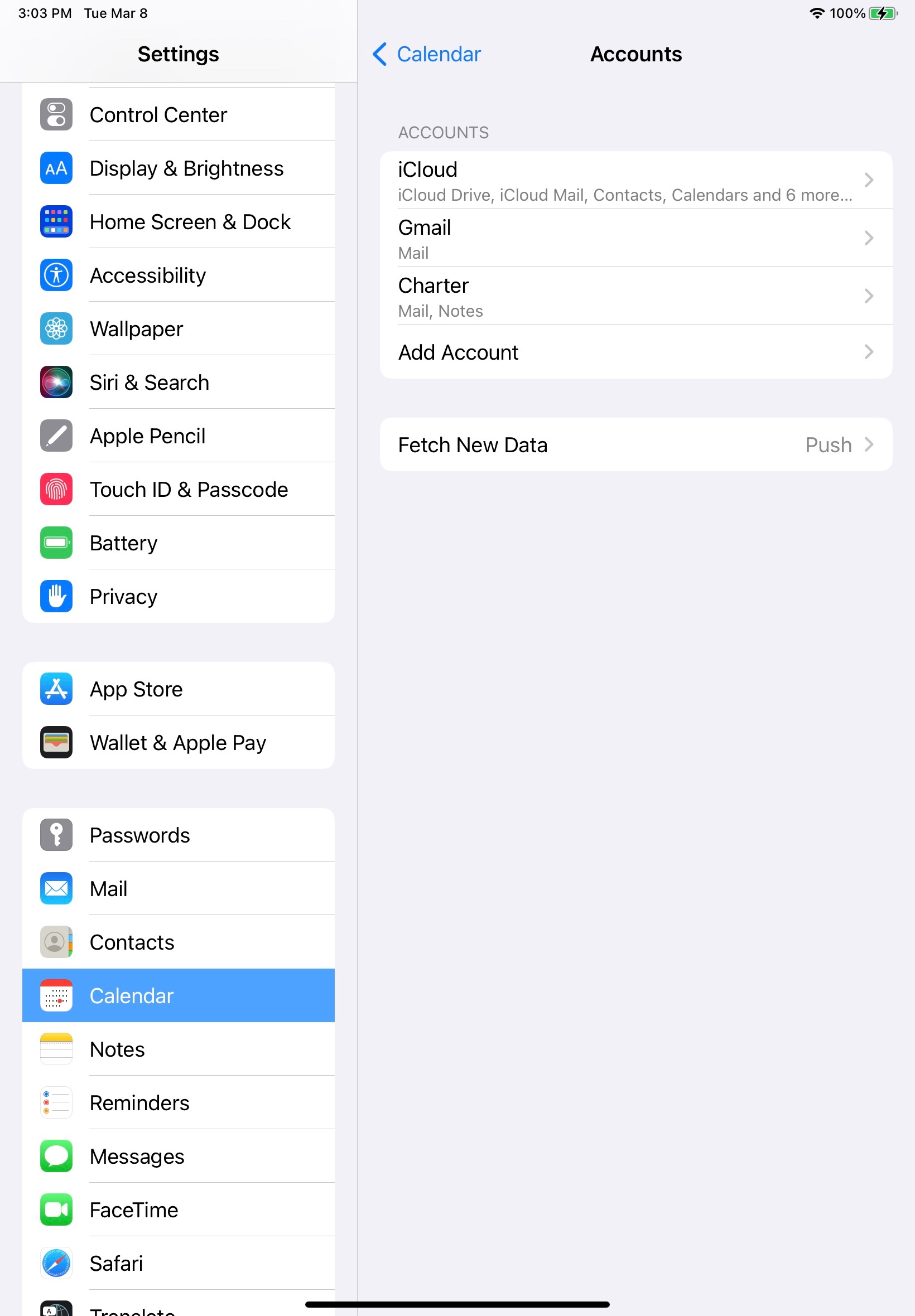 I followed those steps. I opened Settings, tapped Calendar, tapped Accounts.