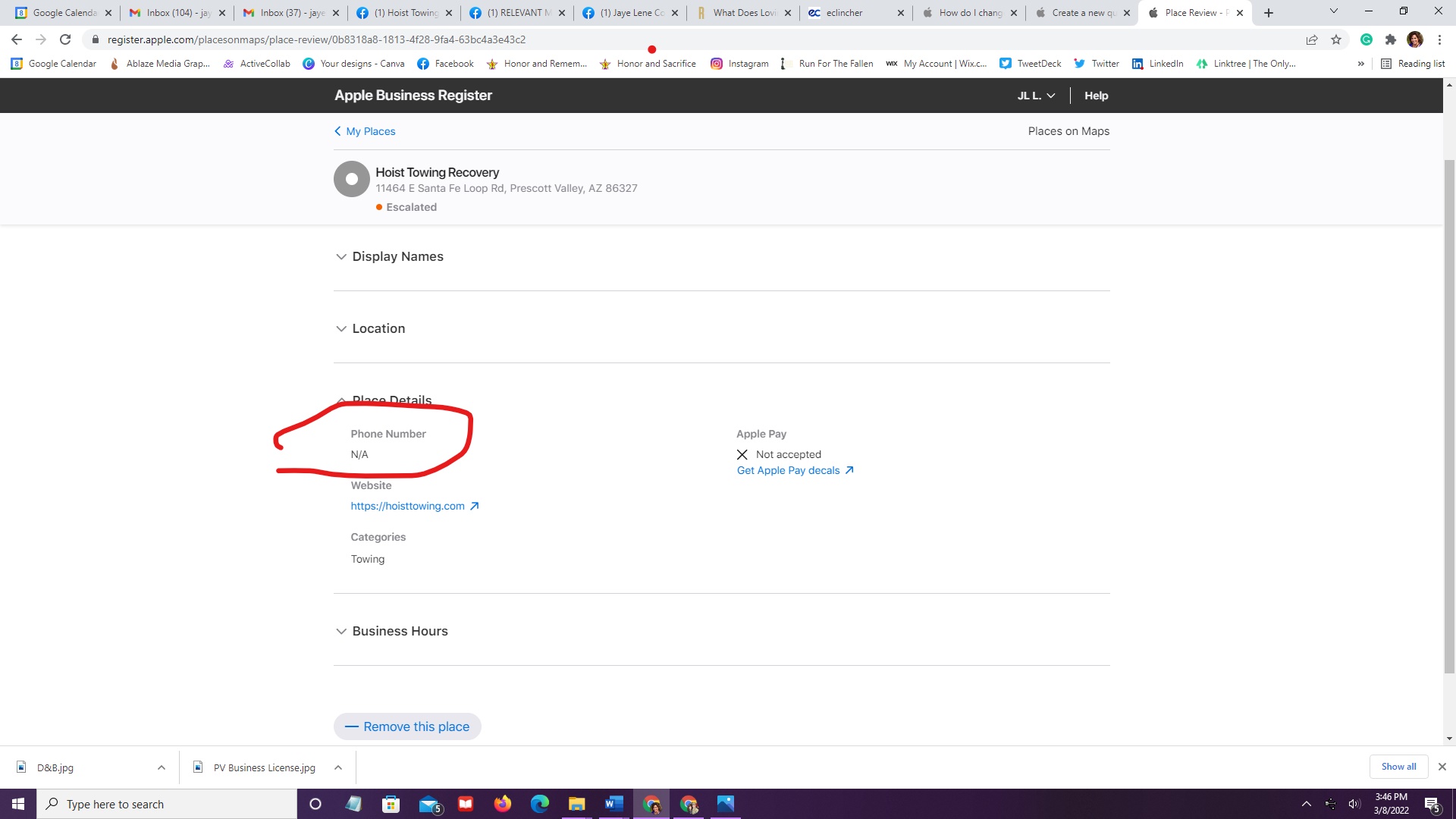 Business phone number not saving to Apple Maps although I have updated it several times. A support request has been submitted.
