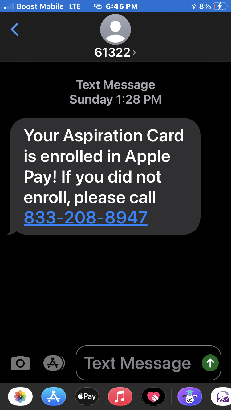 pay 1 I have the card but never used it or added funds it seemed sketchy to me. 2 I definitely never added it to my Apple Pay 3 when I check my wallet it is not there and 4 when I called number first thing they asked for was my credit card number something just seams sketchy and with all the scrams going I’m alittle nervous.