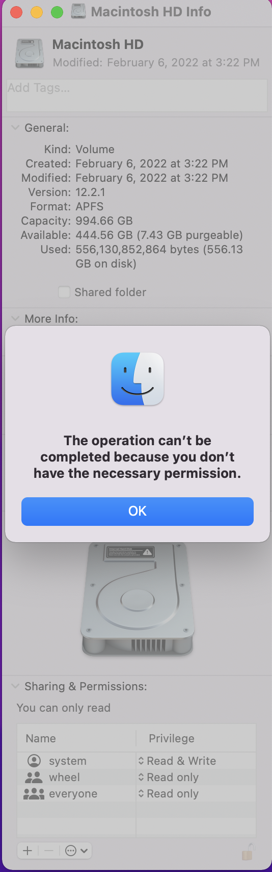 I bought a new iMac and merged my old Macbook Pro info over from a Time Machine backup. Everything went well for moving the apps, favorites, and settings over but it did not move my folders over. I moved them to my desktop today and when I tried to drop them into the internal hard drive it won't allow me to do it. When I pull up the get info window on the HD my name isn't there so I click the plus button and when I try to add my name it tells me I don't have the permissions to add me even though I am in users as an admin. I ran disk first aid and even did it from safe mode. Any idea how to fix the issue?