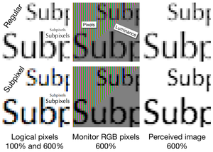 By using pixels with specific colours (instead of pure grays/opacity levels of a specific colour) at the edges of stems and curves in letters, so that their respective red, green and blue sub-pixel components light up in specific patterns according to their relative positions, this technology effectively triples the available resolution on the x-axis for text rendering.
