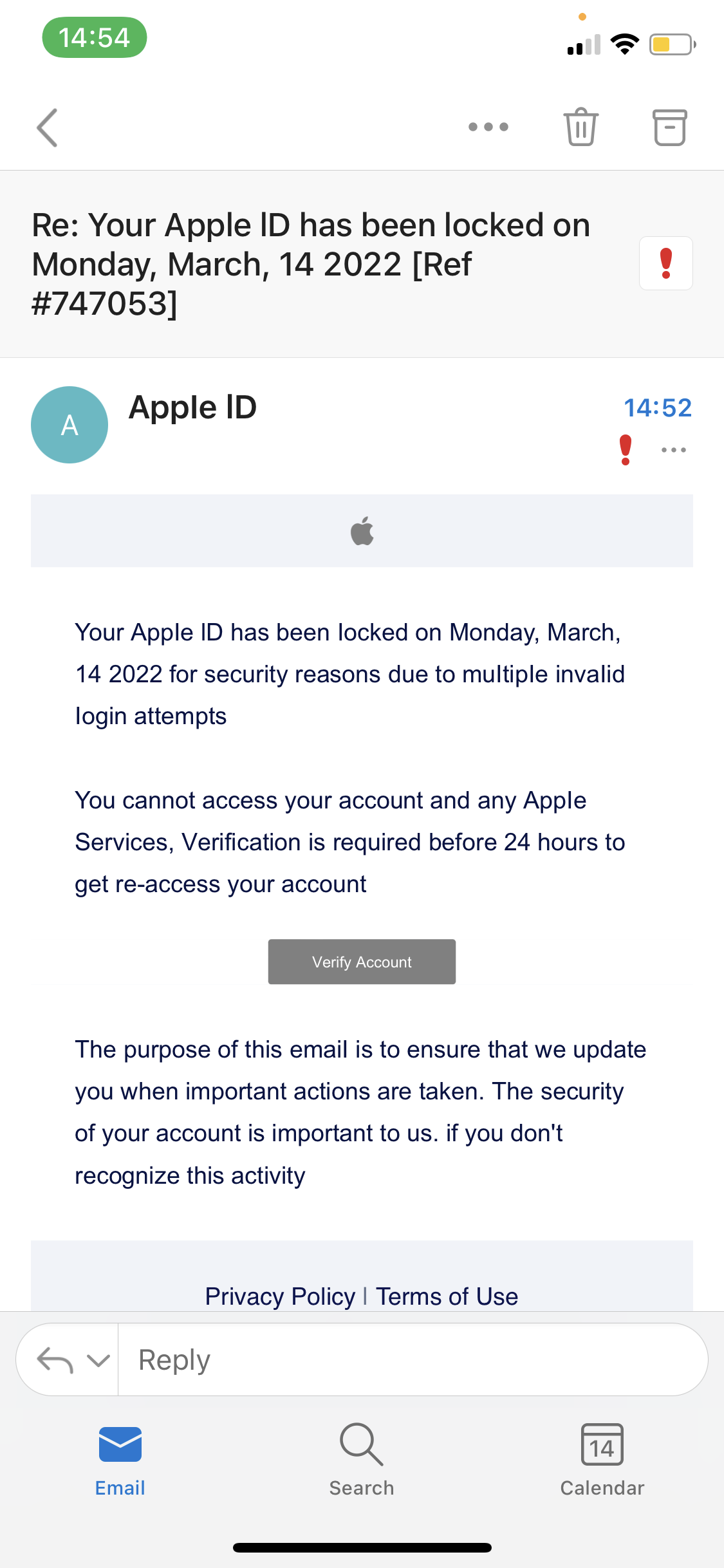 It's fake. Forward it to reportphishing@apple.com as an attachment and then delete it.