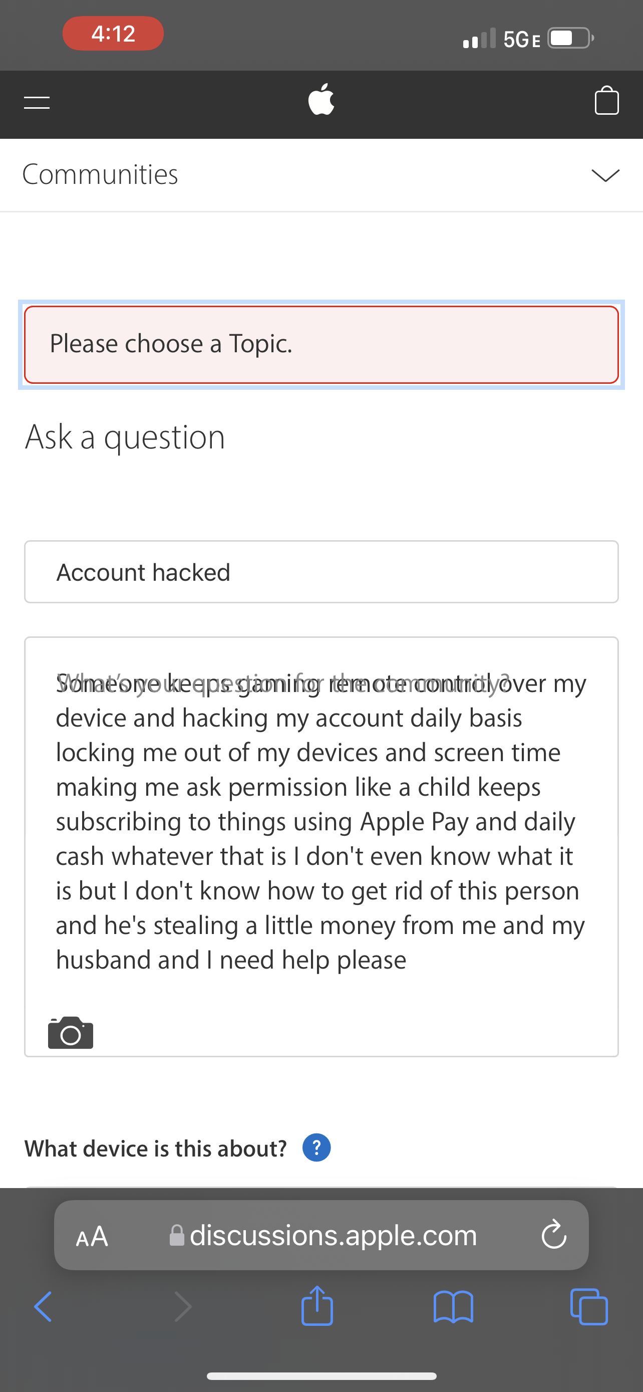 Someone keeps gaming remote control over my device and hacking my account daily basis locking me out of my devices and screen time making me ask permission like a child keeps subscribing to things using Apple Pay and daily cash whatever that is I don't even know what it is but I don't know how to get rid of this person and he's stealing a little money from me and my husband and I need help please