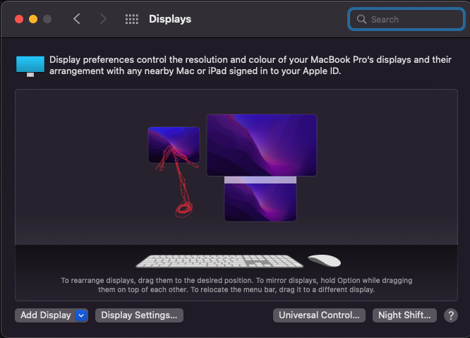 I'm running macOS Monterey 12.3 (21E230) on a late 2015 iMac, with a companion Samsung 27" monitor to the left of my iMac. The left Samsung monitor is hung high enough that I can place my 4th Generation iPad Air running iPad OS 15.4 just underneath it (that is, down and to the left of my iMac). The problem is I cannot move my cursor to the iPad where it is physically located--instead, Universal Control seems to insist I place the iPad to the right of my iMac.