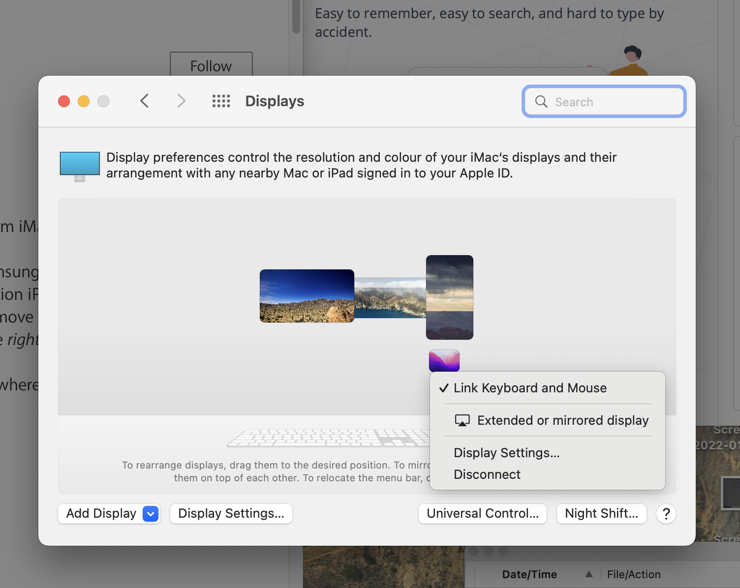 I'm running macOS Monterey 12.3 (21E230) on a late 2015 iMac, with a companion Samsung 27" monitor to the left of my iMac. The left Samsung monitor is hung high enough that I can place my 4th Generation iPad Air running iPad OS 15.4 just underneath it (that is, down and to the left of my iMac). The problem is I cannot move my cursor to the iPad where it is physically located--instead, Universal Control seems to insist I place the iPad to the right of my iMac.
