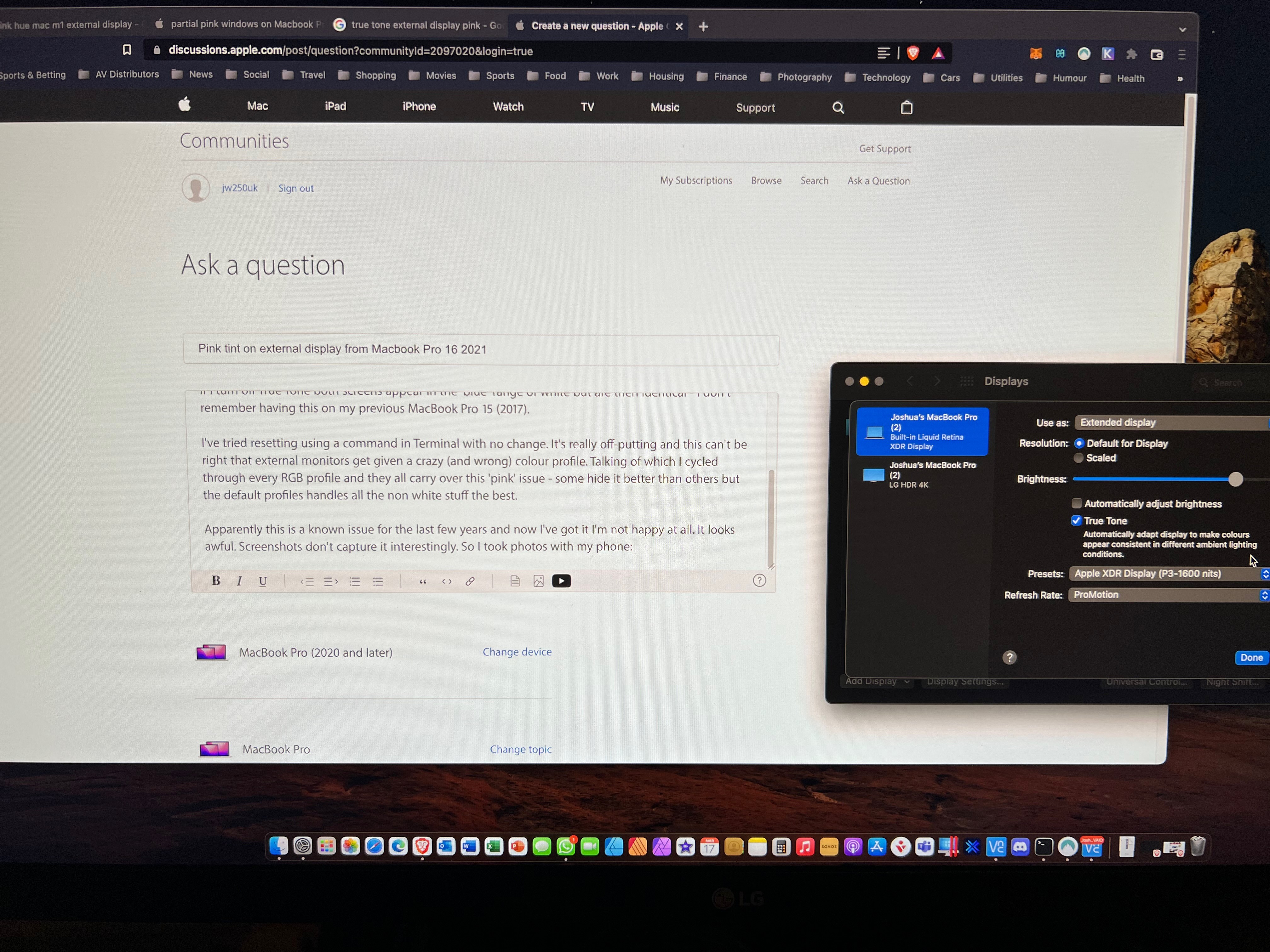 When I connect my MBPro 16 to my external LG 4K monitor, in the evening with normal artificial lighting on (warm LED spots etc), while the laptop colours look absolutely perfect the external monitors white-range has a distinct and obvious pink tint. The two screens areas of white (such as a webpage) are literally different colours, one being actual white and some grays that are there intentionally - on the external monitor those white a pink and the grays are even more pink.