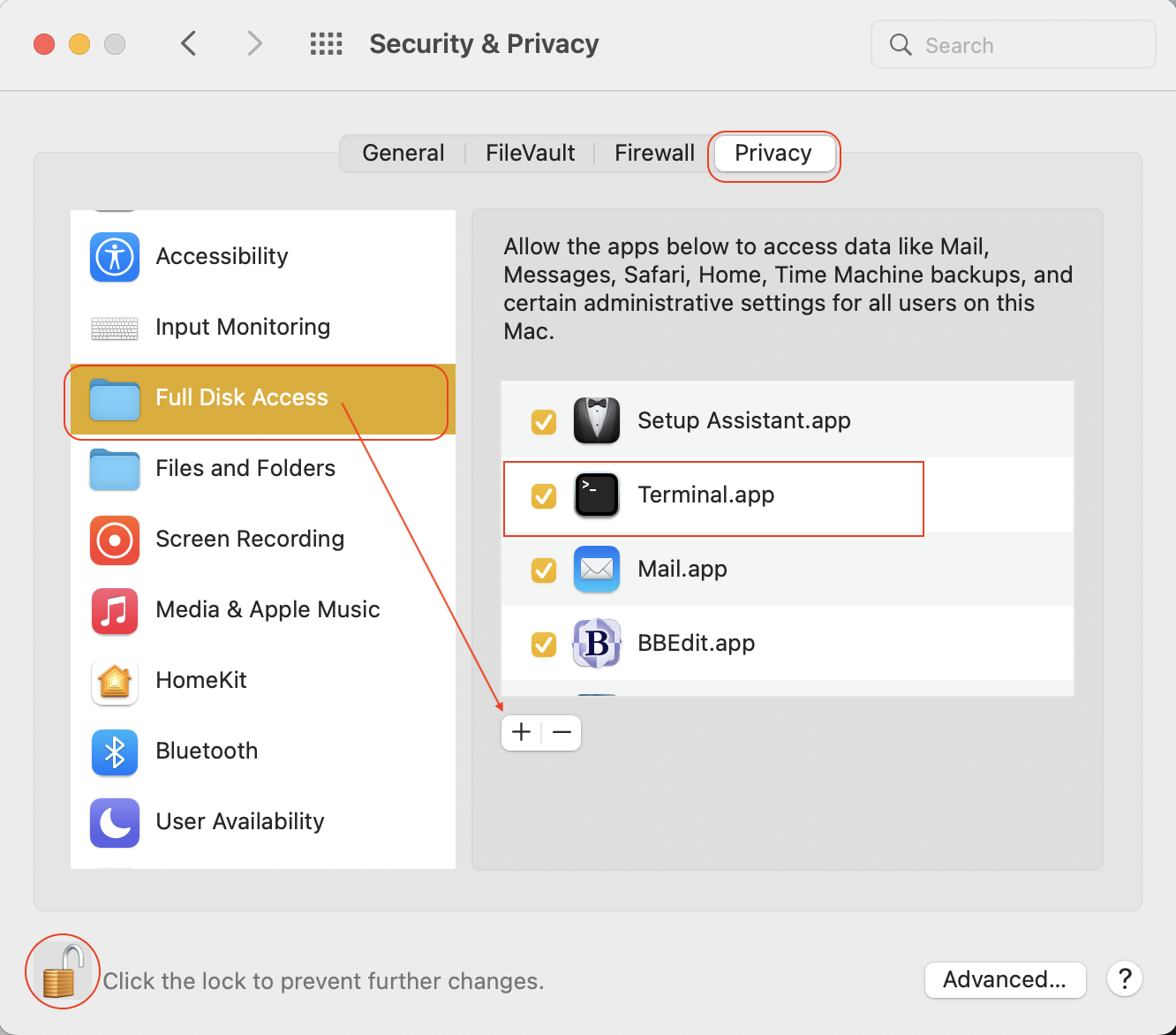 >System Preferences>Security & Privacy>Privacy>Full Disk Access> use the +/- to add Terminal