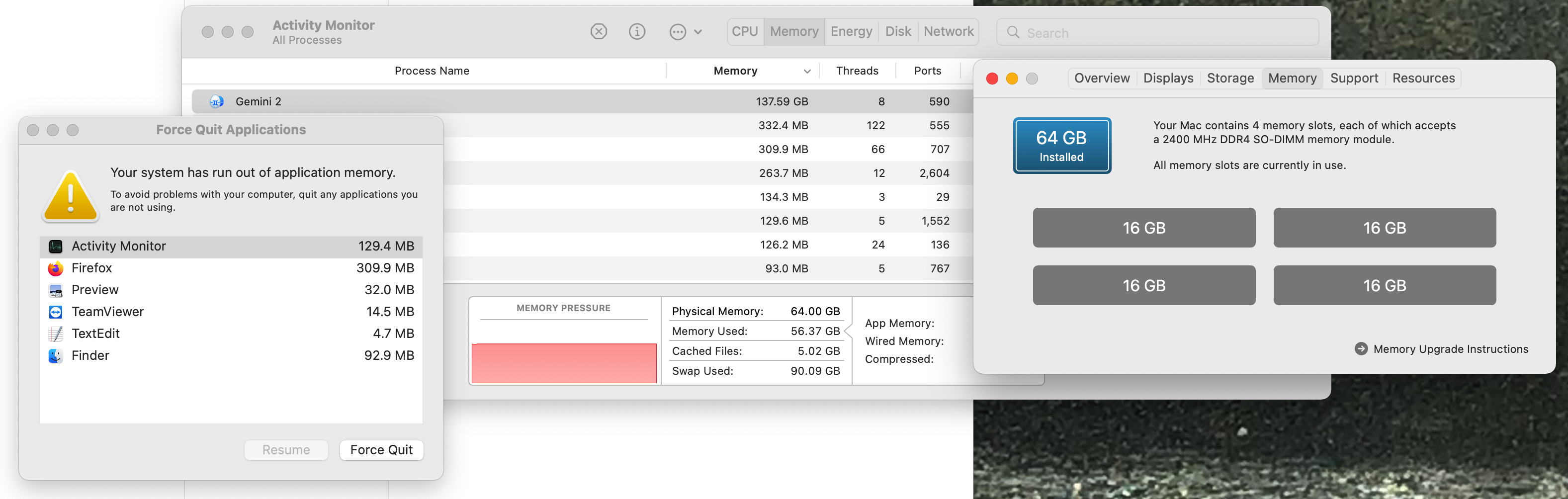 Hello. I'm operating Monterey 12.0.1 on a 2017 iMac, with 64 GB of RAM. The computer is out of application memory, but the applications open use 525 MB. The Activity Monitor shows Gemini 2 -- a duplicate file finder -- is using 137 GB of memory. (1) is this what is using 56.44 GB of App Memory? If yes then, (2) How? The screenshot below shows that it is not one of the apps running. (3) How do I stop the Gemini 2 application from using App memory when it is not being used? Thank you.