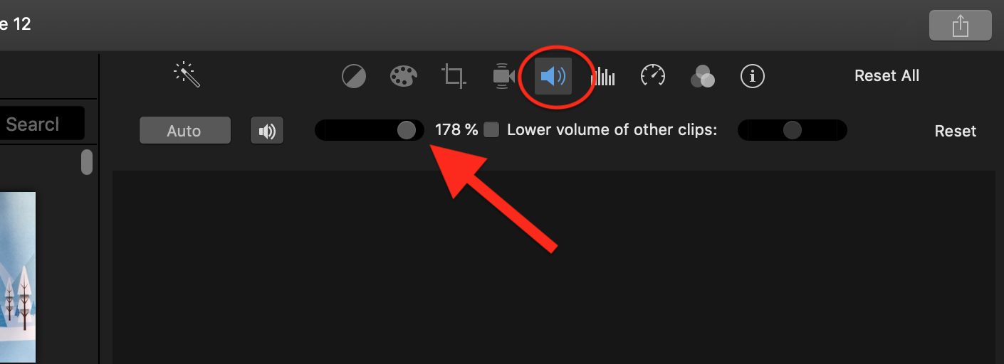Another way is to select the clip by clicking on it and then click on the little loudspeaker icon in the tool bar in the upper right of your screen. That will reveal the audio controls. You will see a slider where you can raise or lower the volume by percent.