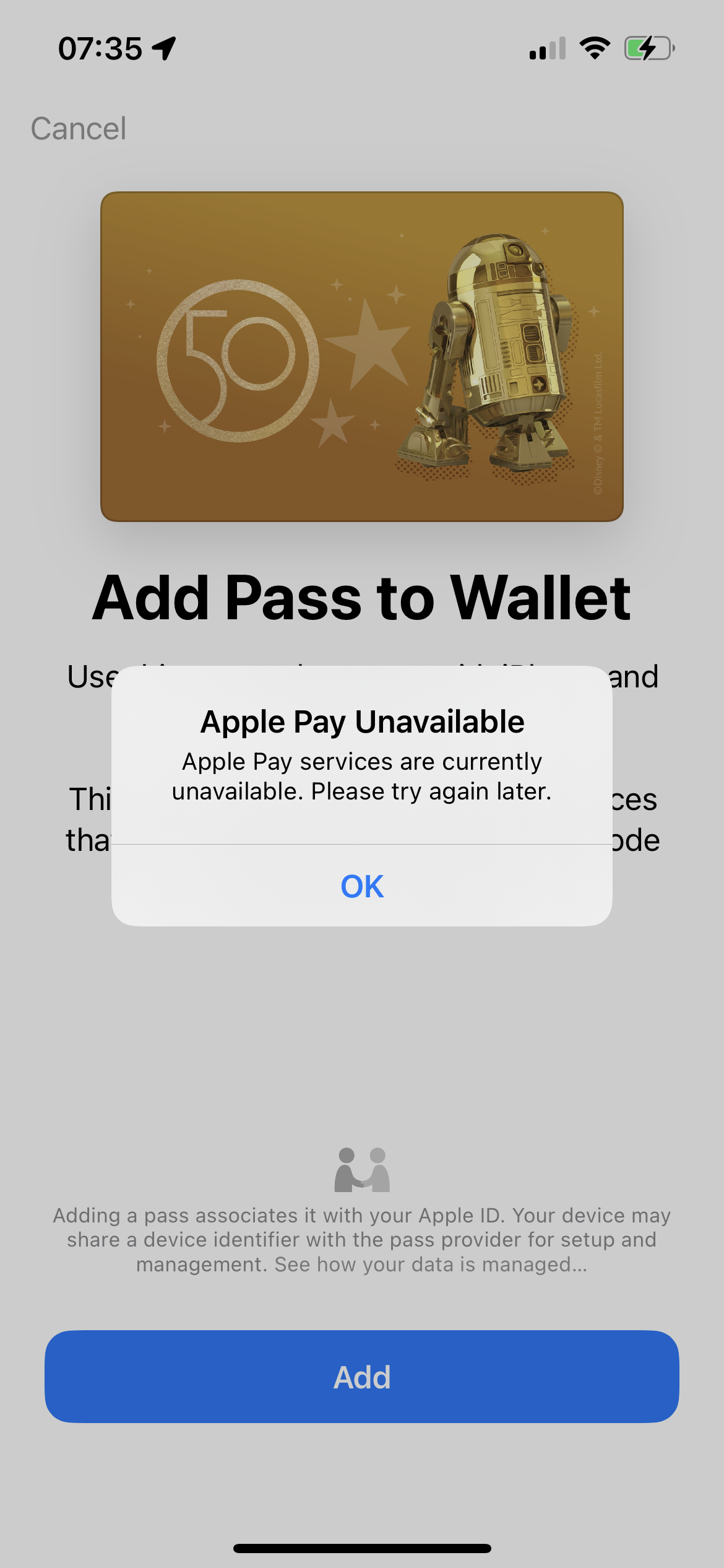 When trying to add my park pass to Apple Pay via the Disney App, I am encountering this error. Can anyone help?