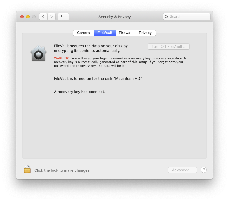 Under System Preferences/Security & Privacy/FileVault, the option to Turn Off FileVault is greyed.