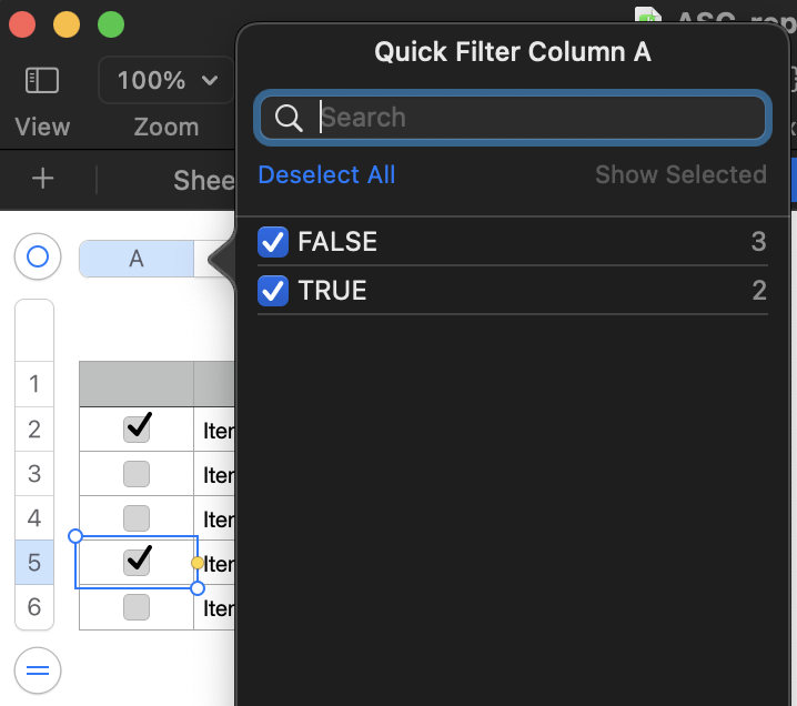 How to copy all rows of a table in which a checkbox is ticked in Numbers?