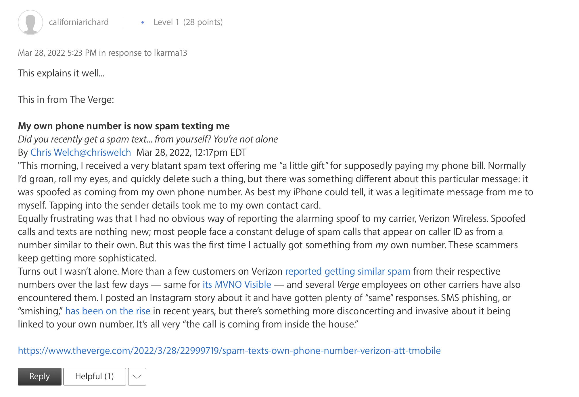 Turns out I wasn’t alone. More than a few customers on Verizon reported getting similar spam from their respective numbers over the last few days — same for its MVNO Visible — and several Verge employees on other carriers have also encountered them. I posted an Instagram story about it and have gotten plenty of “same” responses. SMS phishing, or “smishing,” has been on the rise in recent years, but there’s something more disconcerting and invasive about it being linked to your own number. It’s all very “the call is coming from inside the house.”