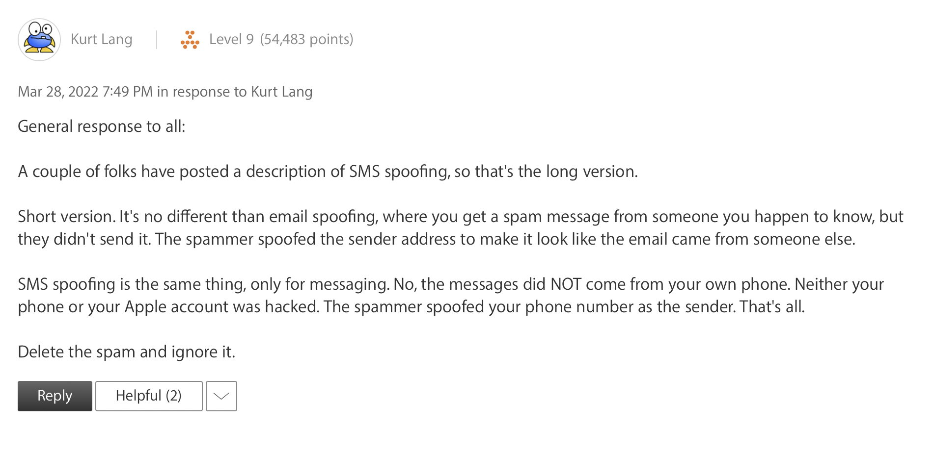 This morning, I received a very blatant spam text offering me “a little gift” for supposedly paying my phone bill. Normally I’d groan, roll my eyes, and quickly delete such a thing, but there was something different about this particular message: it was spoofed as coming from my own phone number. As best my iPhone could tell, it was a legitimate message from me to myself. Tapping into the sender details took me to my own contact card.