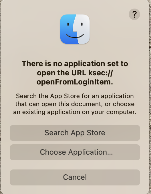There is no application set to open the URL ksec://openFromLoginItem.