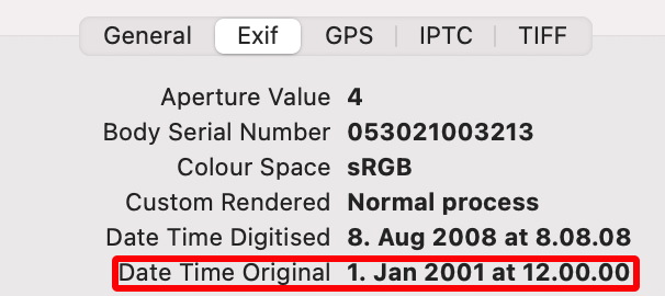 [ExifIFD] DateTimeOriginal : 2001:01:01 12:00:00