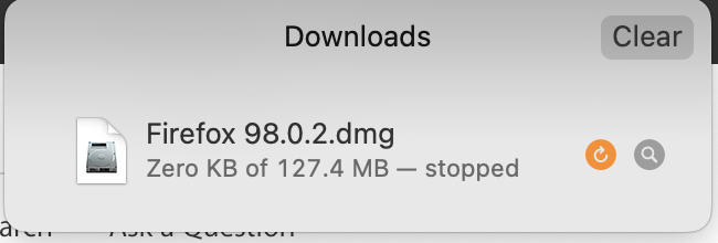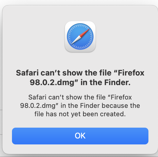 Unable to download Firefox or OfficeLibre. Running Monterey v12.3 and Safari v15.4 (v12.2 and v15.3 also did not work). Additionally, tried to download a .pdf from a vendor site, same problem. Attached are images from Firefox attempt. Seems there is no problem downloading Chrome. Thoughts?
