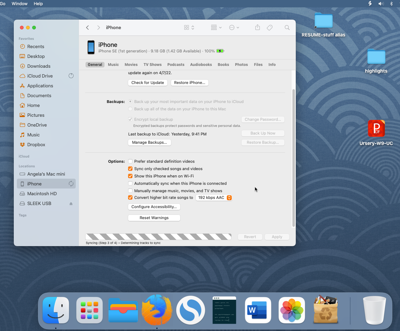 Biggest issue: getting the iPhone disconnected - that is not showing in the Finder - from the Mac. Restarted several times and the pizza still spinning. Sometimes the Finder iphone screen is totally white; other times the controls show (see attachments).