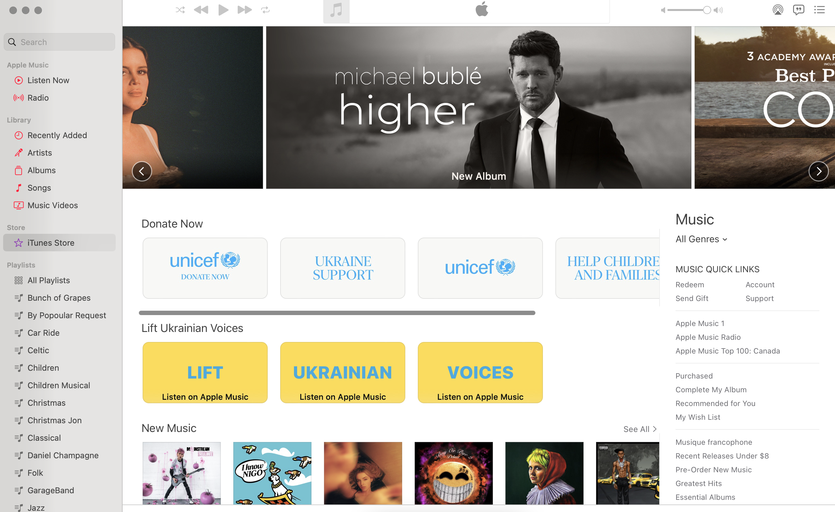 My mac is Monterey 12.2.1 - How do I search the iTunes store? When I search it is only my library. When I click on the iTunes Store link on the left side, I get a top promotion banner, then UNICEF banners, then Ukraine options, then music option but no search option. If I enter anything in the search box on the left, it pops back to my library. Help!