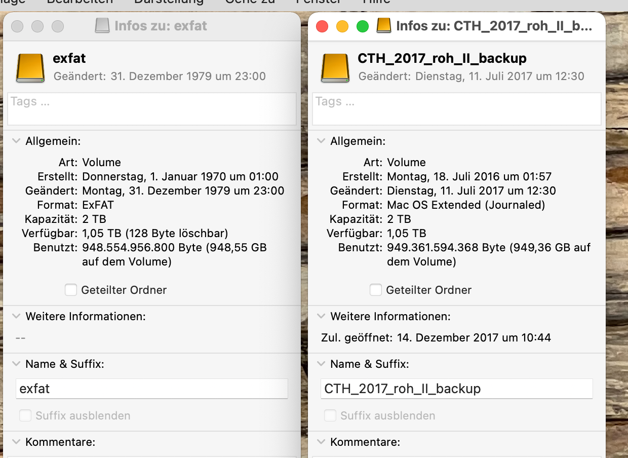 Recently we synced data from a SD card to two identical 2TB harddisks and got the error, that one harddisk is full, while the other still has +- 400GB free space.
