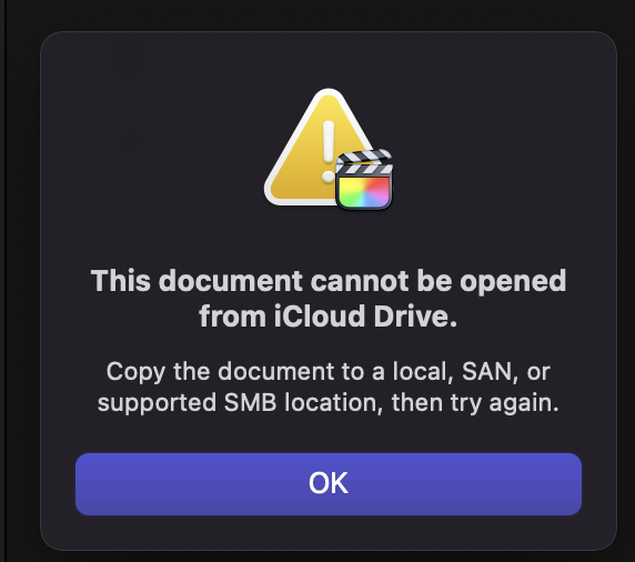 I have Final Cut Pro and previously I have store and open my projects from OneDrive folder without any problems, but at yesterday when I was try to open It again I have got error "This document cannot be opened from icloud Drive. Copy the document to a local, SAN, or supported SMB location, then try again." on screenshot below.