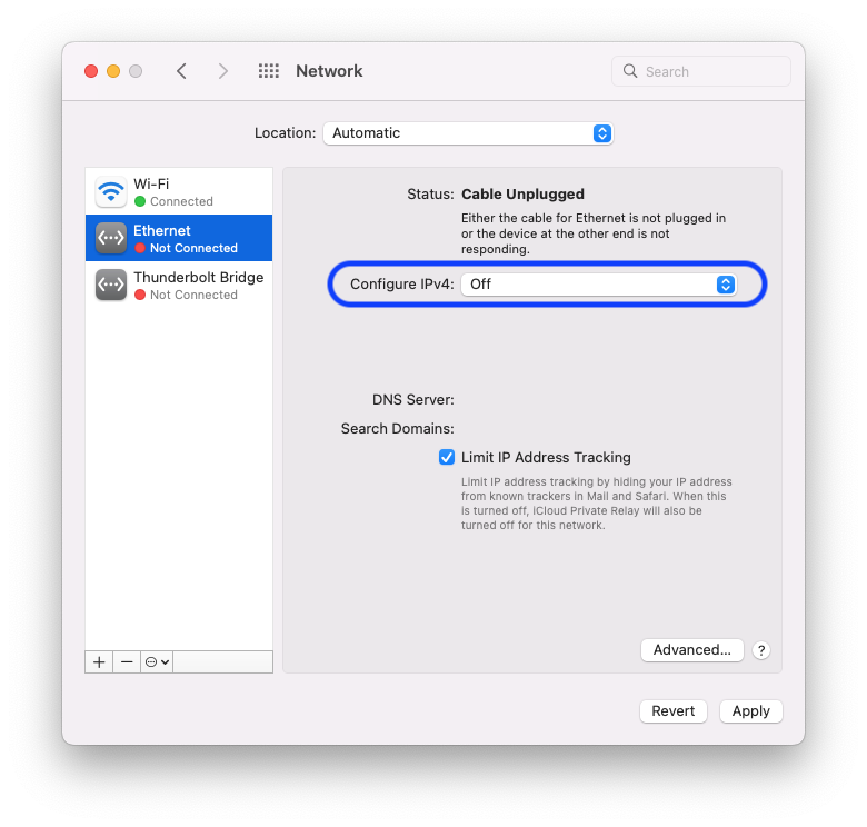 Go to System Preferences > Network, select Ethernet from the left sidebar, and in the "Configure IPv4" dropdown menu, select "Off". Then, click Apply.