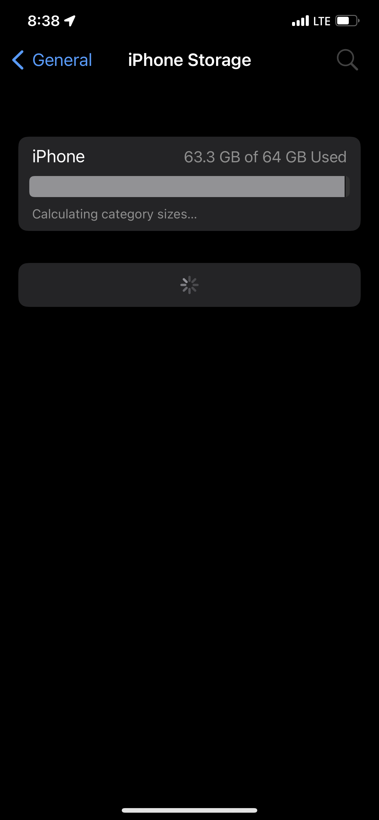 Your iPhone's storage capacity is nearly full - this is likely why it cannot process its content categories in the iPhone Storage view. There is no available space to write to the internal storage.