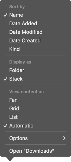 Arghhhh, lost Downloads folder in Dock, so when re-added it, never had this happen before, but it magnifies or expands and shows tiles of downloads in alphabetical order, not sortable! (So the download you just put there is only accessible if it happens to be the first in the alphabet!)