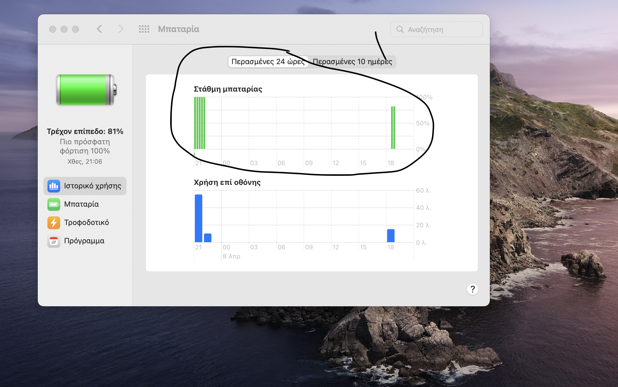 To see what processes are currently running, use this guide View information about Mac processes in Activity Monitor. This is just an FYI because there isn't a history on your Mac battery like you might see on an iOS device.